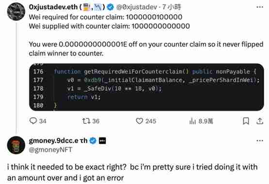 一位名叫 0x282 的买家,在 14 天前发起了 shotgun,提出以每个代币 0.001ETH 的价格(总价 10ETH)收购。这价格远低于市场价,自然有人想阻止。但其中一人犹豫不决,另一位大佬 @gmoneyNFT 则表示,他因为计算错误,导致出价失败!就差那么一点点,煮熟的鸭子就飞了。
