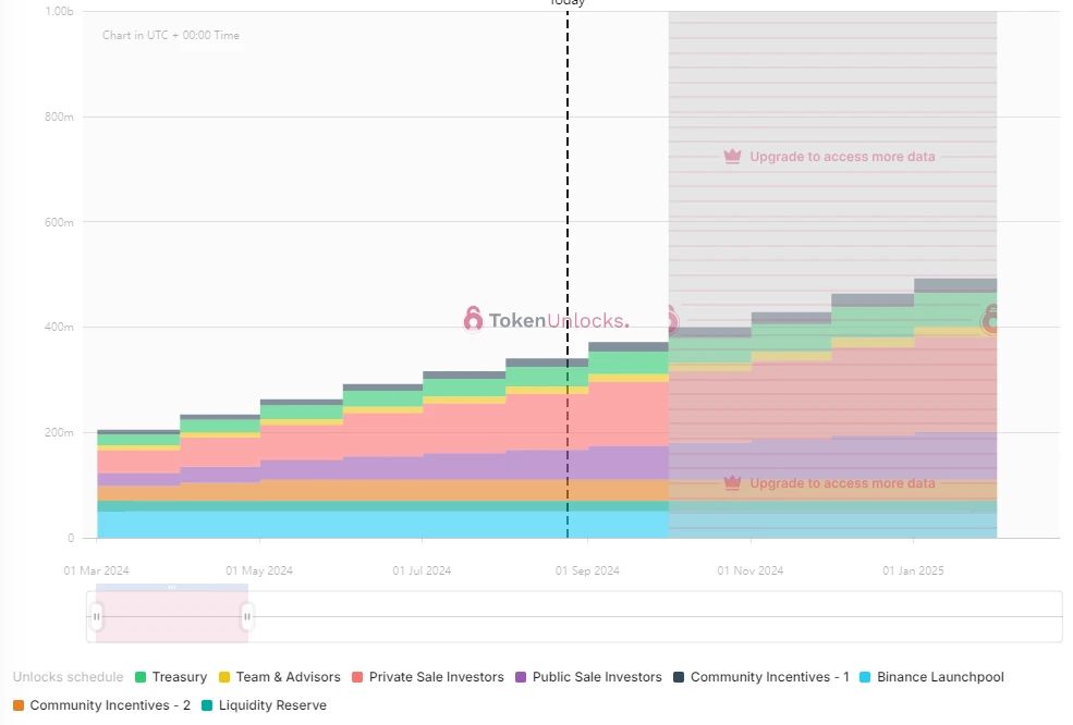 PORTAL已解锁量占总量的33%,当前解锁均为每日的线性解锁,面向私募、公募、团队等,每日解锁量按照当前价格约为24.6万美元。
