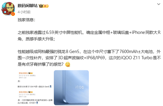 博主“数码闲聊站”今日也爆料,iQOO Z11 Turbo 将采用金属中框与玻璃后盖的组合,并引入了与 iPhone 类似的大 R 角设计,配备一块 6.59 英寸的屏幕。