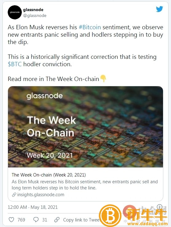 Glassnode 认为,这次回调主要是因为埃隆·马斯克周末发表了一些有争议的言论,导致一些新入场的投资者恐慌性抛售。