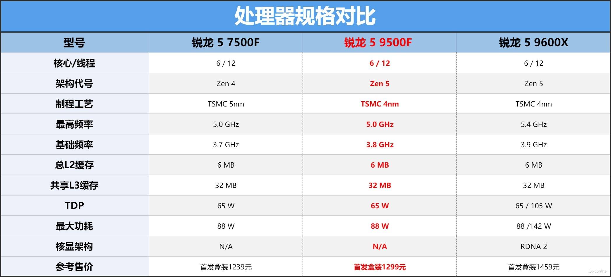 而对比同代的大哥锐龙 5 9600X来说,规格也非常接近,锐龙5 9500F的最大频率比锐龙5 9600X低了400MHz,基础频率则低了100MHz,还少了个核显,除此之外,两款处理器别无二致。