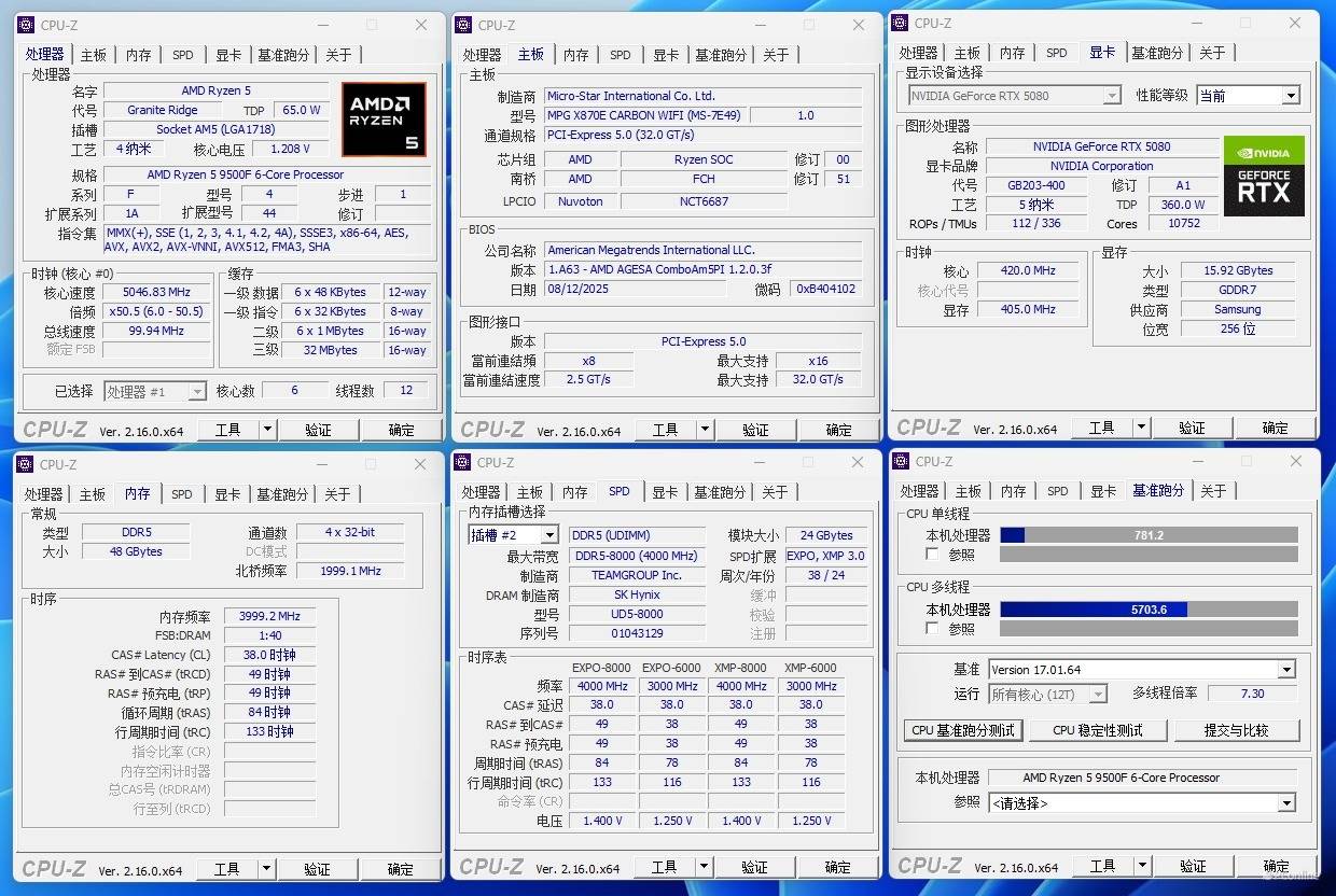 上机后,我们还是先在CPU-Z中看看平台硬件信息,实测此时锐龙5 9500F单核跑分761.2,多核跑分5703.6。
