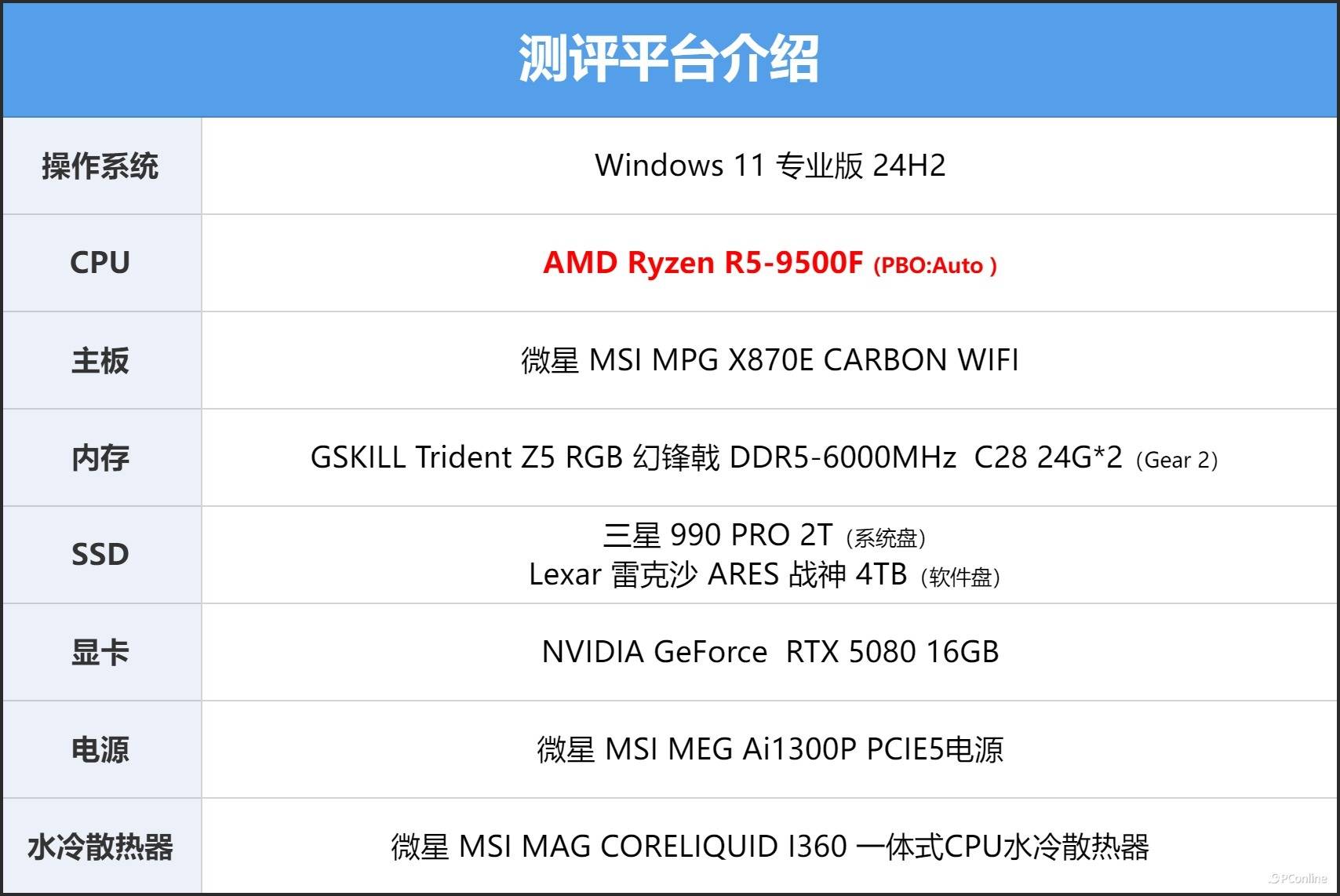 在开始评测前,照例还是给大家介绍一下本次的测试平台。CPU当然是本期的主角锐龙5 9500F,主板则是来自微星的MPG X870E CARBON WIFI 暗黑主板。内存为G.Skill的幻锋戟Z5 RGB DDR5,在这块主板上能轻松达成DDR5-6000 C28的成绩,并且我们这次选用的是24G×2的套条。至于我们选用的是RTX 5080,为的是避免CPU瓶颈。