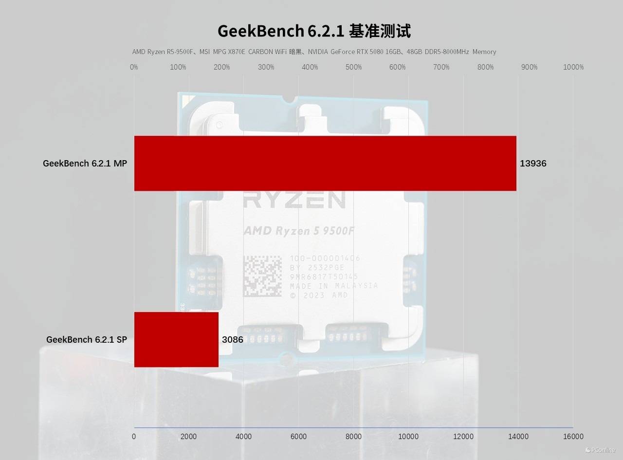 而在GeekBench6的基准测试里,锐龙5 9500F 多核达 13936 分、单核 3086 分,理论性能的 “底子” 还是十分扎实的。