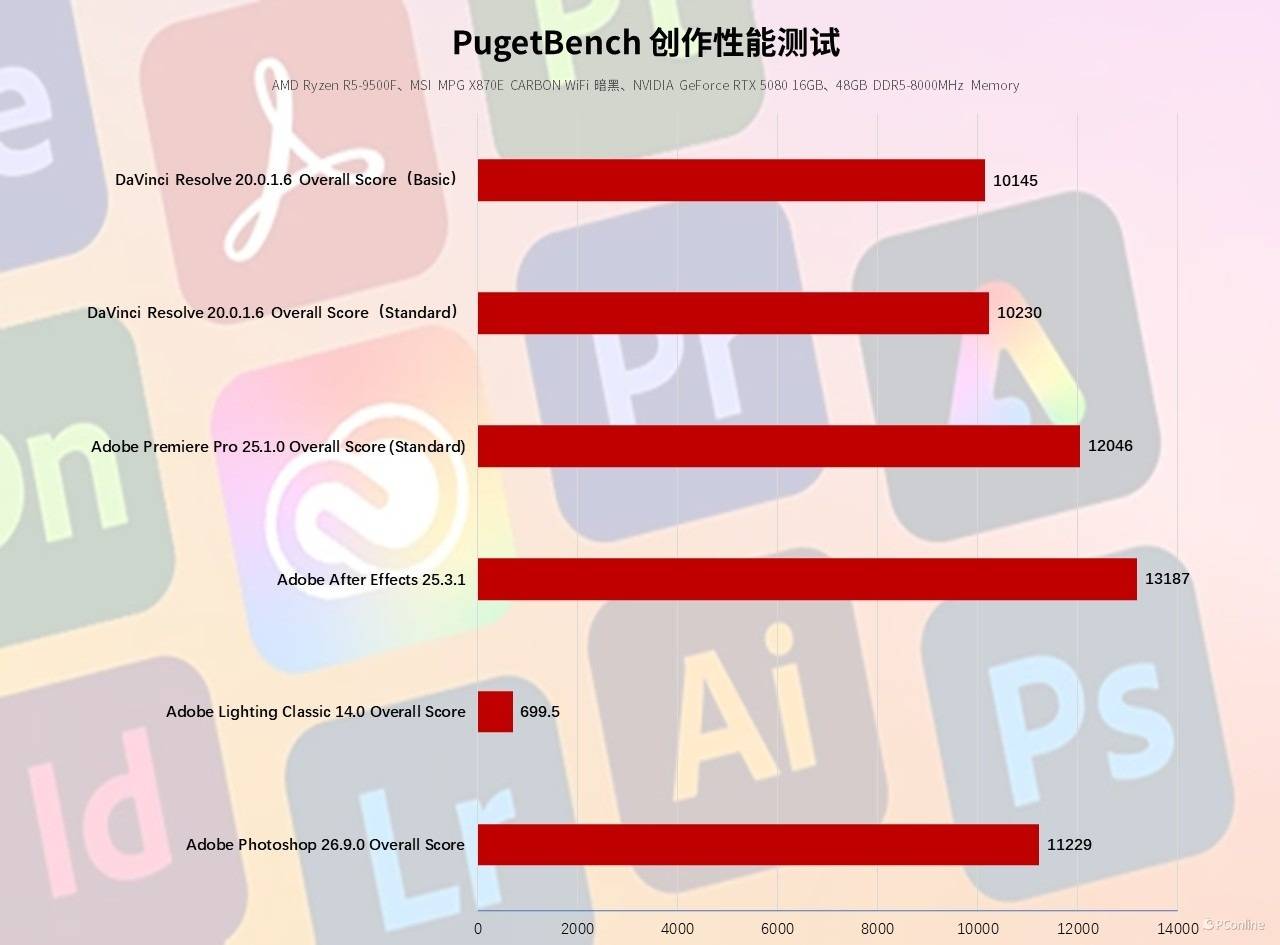 首先,锐龙 5 9500F 在 PugetBench 创作测试中展现出了不俗的实力,DaVinci Resolve 20.0.1.6 基础与标准模式分别斩获 10145、10230 分,Adobe Premiere Pro 25.1.0 更是突破 12046 分,视频剪辑体验可以说是流畅高效;After Effects 25.3.1则获得了13187分,表现同样出众;至于Photoshop 26.9.0也达到了11229 分。从剪辑到特效,从调色到平面设计,锐龙5 9500F全流程创作毫无卡顿,妥妥的内容创作得力助手。
