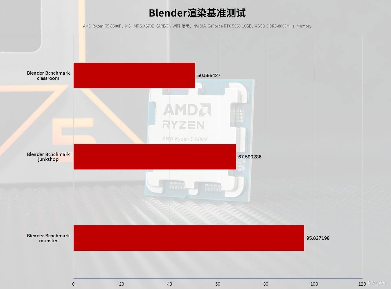 而面对压力更大的Blender渲染基准测试,锐龙 5 9500F也不错,classroom 场景 50.595 分、junkshop 场景 67.590 分,而 monster 场景更是冲到 95.827 分,多核渲染能力拉满。无论是复杂 3D 模型的光影计算,还是大规模场景的细节渲染,都能快速高效完成。