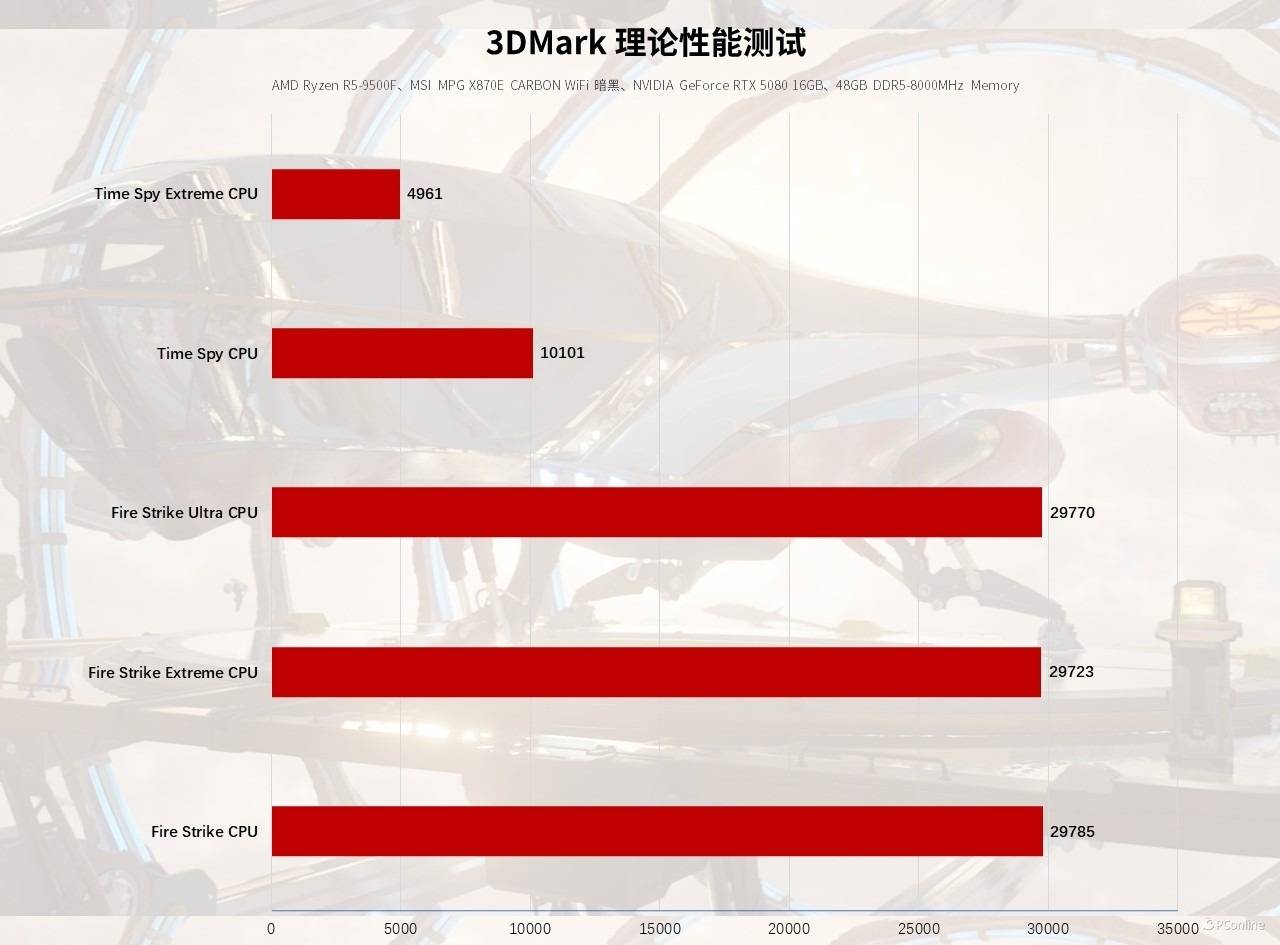 紧接着我们还测试了3DMark的理论性能,无论是在DX11的Fire Strike项目,还是DX12的Time Spy项目,成绩均相当优秀,特别是在Fire Strike中,锐龙5 9500F的成绩都逼近3W分大关,为高画质游戏、创意设计提供充足性能支撑。