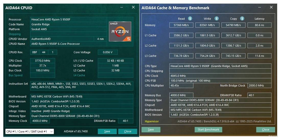 接着我们再来测试一下锐龙5 9500F的内存兼容性与性能表现,这里我们直接强度拉满,实测EXPO-8000MHz一次点亮,并且时序压在C38-49-49-84,此时内存的读取性能达到了57368MB/s,写入则是83561MB/s,复制则为54790MB/s,延迟也优化至80ns,整体表现还是非常不错的。