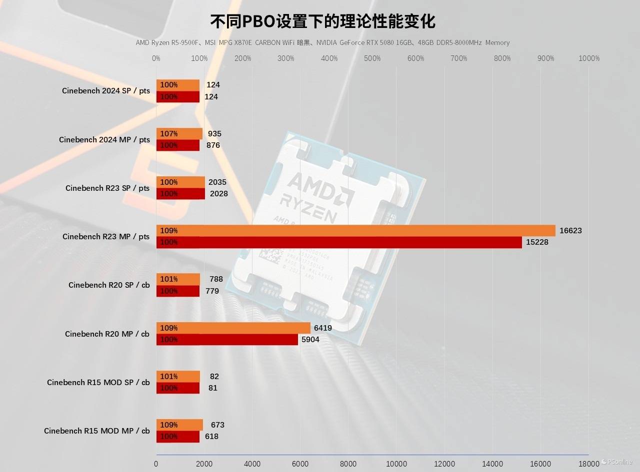 另外我们也测试了不同PBO设置下的性能表现,这里可以看到在解锁温度墙至85℃以后,锐龙5 9500F的单核以及多核成绩都有不同程度的提升,尤其是多核方面,最大性能可以提升9%左右,还是非常可观的。