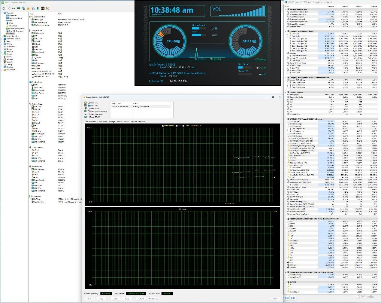 最后,让我们通过烤机来看看锐龙 5 9500F 处理器的实际散热和功耗表现究竟如何。首先我们在PBO AUTO的情况下进行AIDA64 FPU烤机10分钟,此时CPU 的温度稳定在 60.4℃,此时 6 个大核的频率为3.7 GHz,CPU功耗为88W。