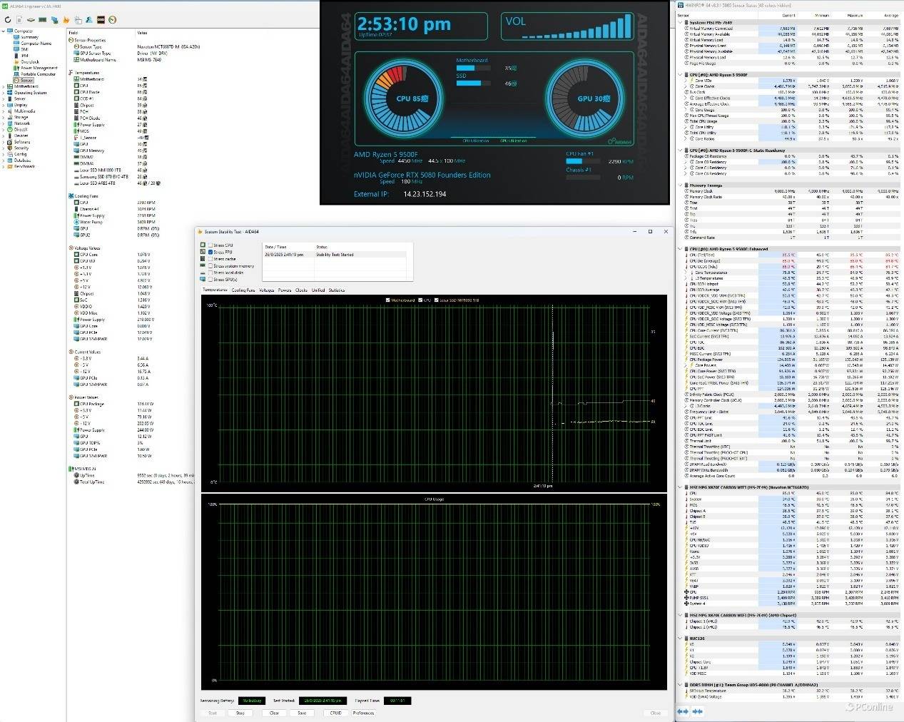 接着我们又用微星主板的PBO功能,将其温度墙解锁至85度,再次进行AIDA64 FPU烤机测试,此时处理器的频率有了大幅提升,6个大核的频率可以跑到4.5 GHz左右,温度则是85℃,处理器功耗也来到了125W。