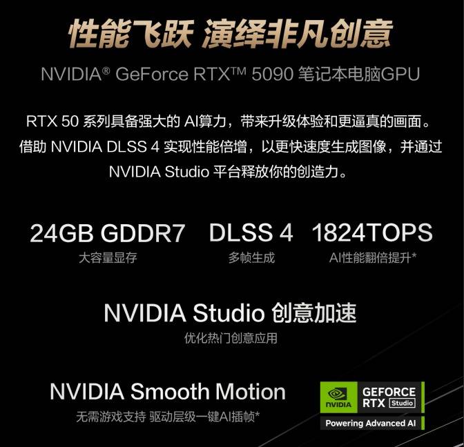 锐龙AI 9 HX 370作为AMD最新一代旗舰移动处理器,采用12核24线程设计,主频高达5.1GHz,单核性能与多核性能均达到移动端顶尖水平。对视频创作者而言,这意味着在Premiere Pro中剪辑素材时,时间线拖动不再卡顿。而NVIDIA RTX 5090移动端显卡则是性能的暴力担当,它拥有1824 TOPS AI算力,搭配24GB GDDR7超大显存,直接将创作场景的性能天花板拉高,比如在用StableDiffusion生图时,即便高分辨率也能实现秒出。