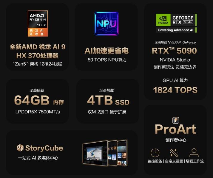 专业创作的复杂场景,从4K视频剪辑、3D建模到AI生成,既需要处理器的多核性能应对多任务调度,又依赖显卡的并行算力加速渲染与计算。华硕ProArt 创16 2025搭载的AMD锐龙AI 9 HX 370移动处理器与NVIDIA RTX 5090移动端显卡,通过协同发力,让创作全流程如丝般顺滑。