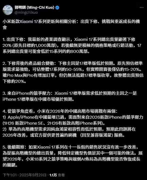 【太平洋科技快讯】9 月 29 日消息,天风国际证券分析师郭明錤今日发布博文表示,小米 17 系列的总出货量显著下调 20%,原定目标约为 1000 万台。若未来定价策略或市场营销未进一步优化,该系列总出货量可能低于前代小米 15 系列的约 800 万台。