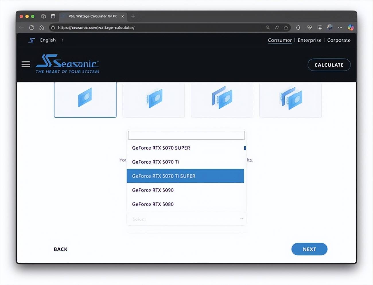 从海韵的功率计算器流程来看,选择完CPU然后就会到GPU界面,这个时候可以看到两款GeForce RTX 50 Super系列产品,分别为RTX 5070 Ti Super和RTX 5070 Super,对应的整卡功耗分别为350W和275W,这个功耗基本和之前曝光的小道消息相吻合。所以如果不出意外的话,未来这两款显卡应该就是这个功耗了。