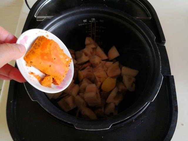 2. 将莲藕去皮后切成小块放入电炖锅中,