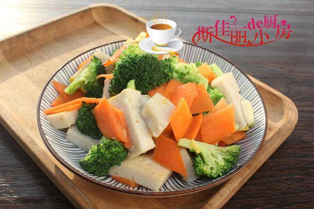 推荐菜谱【西兰花炒鱼糕】 】原料: 西兰花 1盘 鱼糕1小块 胡萝卜半根 蒜 3瓣 油盐 少许