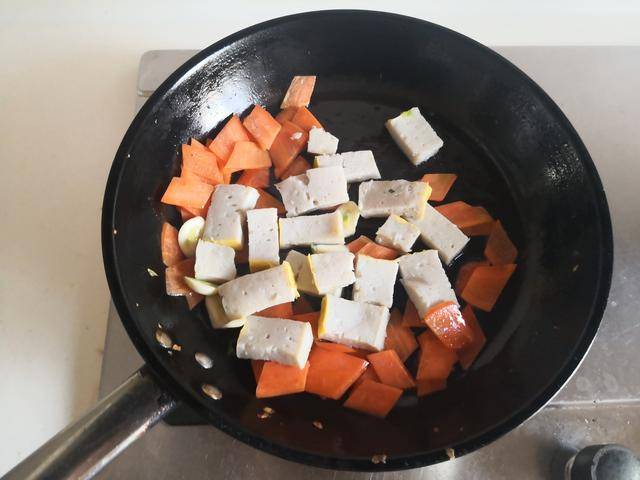 3. 加入准备好的鱼糕块放进锅中翻炒几下;