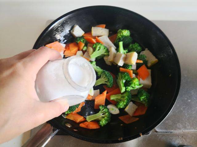 4. 加入焯好的西兰花放进锅中翻炒几下,再加入少许盐调味,翻炒均匀即可。