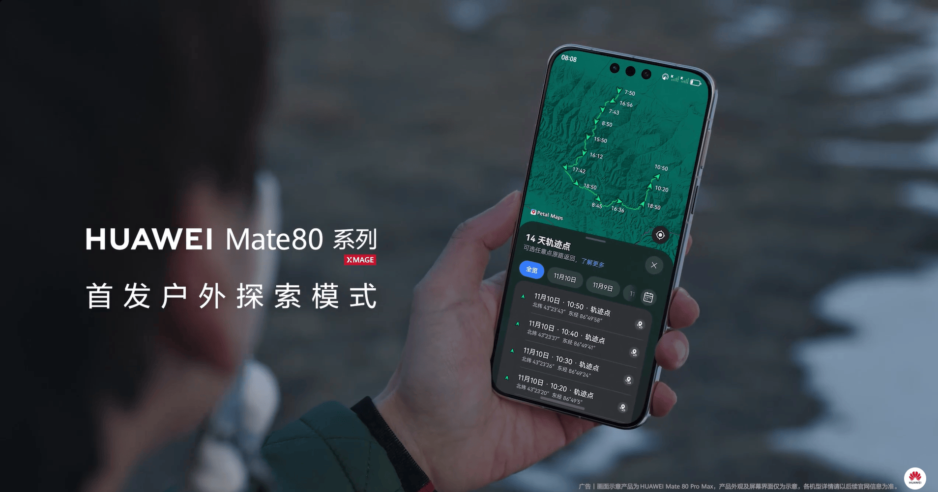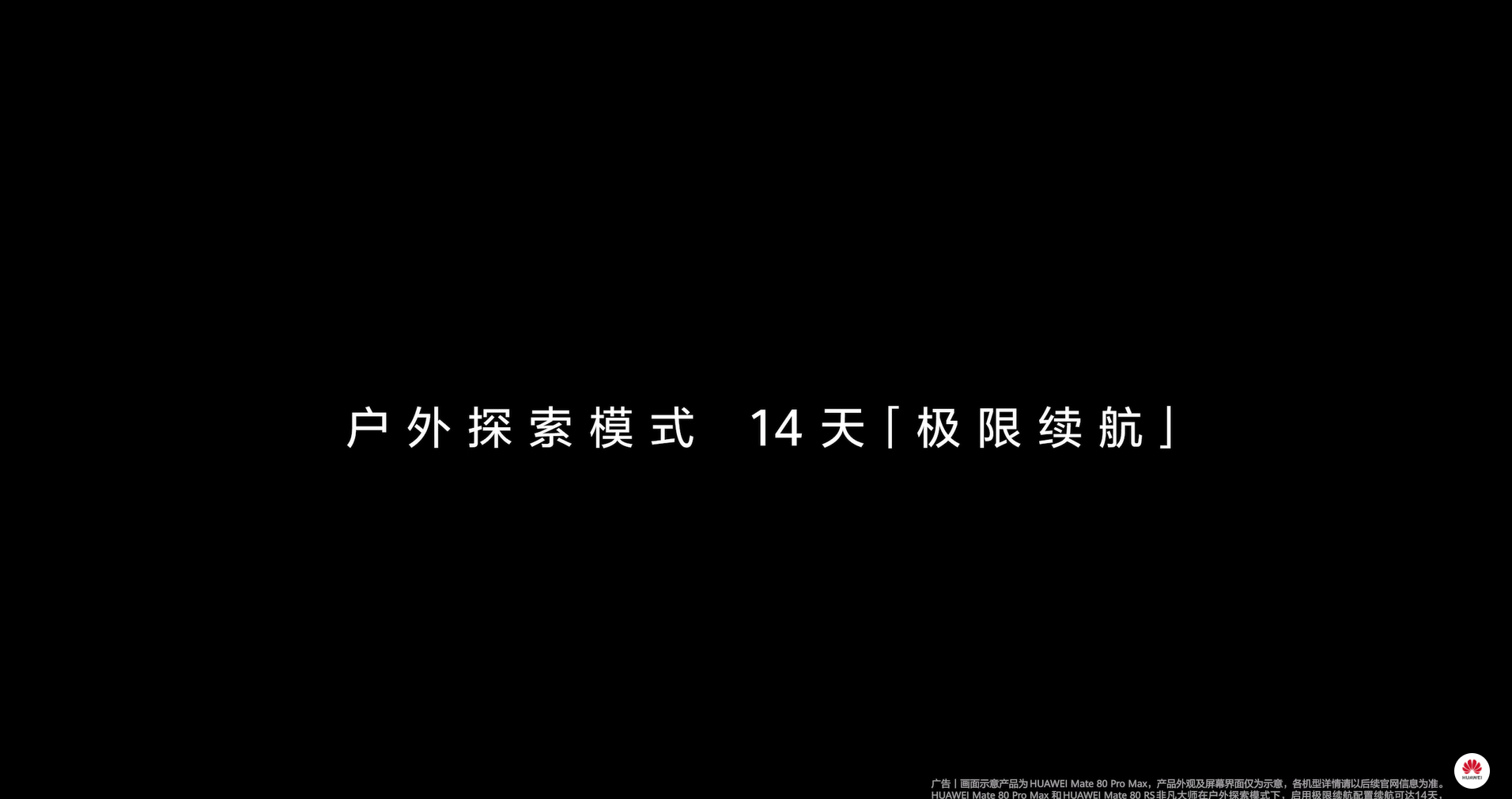 值得一提的是,视频右下角标注了画面示意的产品为华为 Mate 80 Pro Max,Mate 80 Pro Max 和 Mate 80 RS 非凡大师在户外探索模式下,启用极限续航配置续航可达 14 天,各机型详情需以后续官网信息为准。
