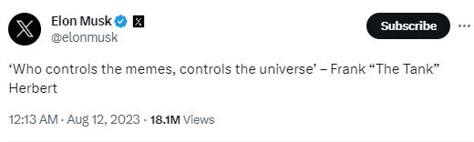谈到 meme 资产的发展,有一个人是绕不开的,那就是马斯克。毫不夸张地说,如今 meme 领域的龙头——狗狗币,能有今天的发展,与马斯克的宣传有着密不可分的关系。他曾多次公开支持狗狗币,每一条推文,都会引发广泛的讨论和关注。自从狗狗币在上轮牛市暴涨至市值前十后,马斯克在区块链行业的声望和影响力也达到了顶峰。他的一条推文,可以对 meme 资产的价格产生巨大的波动,甚至引发市场的疯狂。由于他经常在推特发表与加密货币和 memecoins 相关的推文,他也成为了行业内散户重点关注的对象之一。