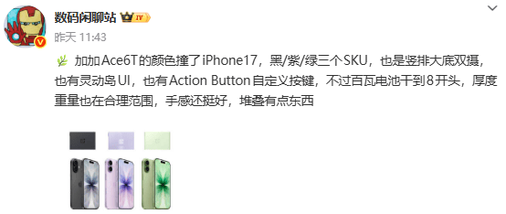 博主“数码闲聊站”昨日曝光了该机的外观细节。据称,一加 Ace 6T 将提供黑、紫、绿三款配色,其色彩方案与 iPhone 17 相撞。背部将采用竖排大底双摄设计,也有灵动岛 UI,并配备 Action Button 自定义按键。