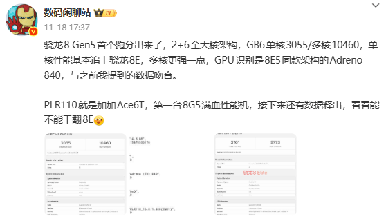 值得一提的是,该博主发布的型号为“PLR110”的一加 Ace 6T 跑分截图显示,骁龙 8 Gen5 在 GB6 上单核 3055 分,多核达 10460 分,单核性能基本追上骁龙骁龙 8 至尊版,多核则比骁龙 8 至尊版更强,GPU 型号为骁龙 8 至尊版同款 Adreno 840。