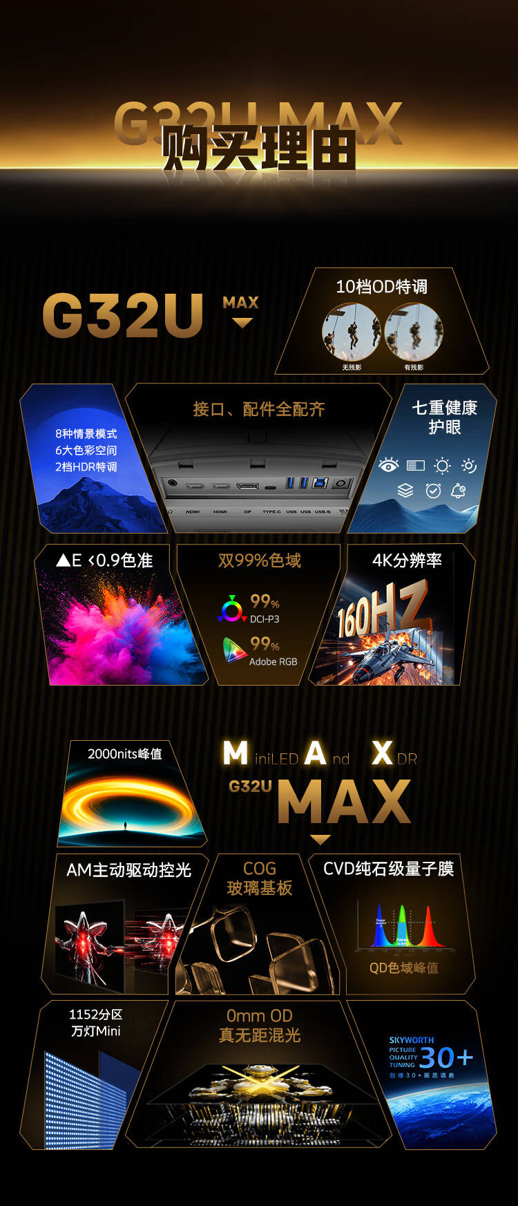 【太平洋科技快讯】11 月 20 日消息,创维 SKYWORTH 已在电商平台上架了 G32U Max 显示器。该显示器采用 31.5 英寸QD Mini LED Fast IPS 面板,新一代 MiniLED,拥有 1152 个背光分区,1152 个控光芯片、1 区 9 灯、共计 10308 颗 LED 灯珠。