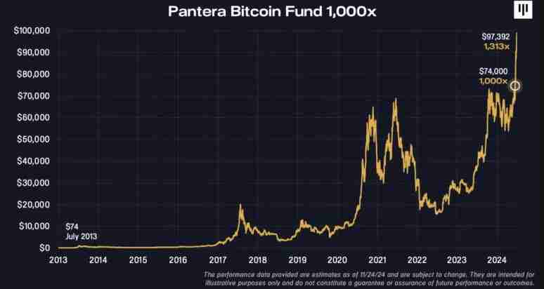 Pantera Capital的比特币基金早在2013年就已推出,当时比特币的价格仅为74美元。在2013年至2015年间,Pantera Capital的比特币基金持有量占全球供应量的2%。随着比特币价格一度突破9.9万美元,扣除所有费用和开支后,Pantera Capital的初始投资已增值131,165%。