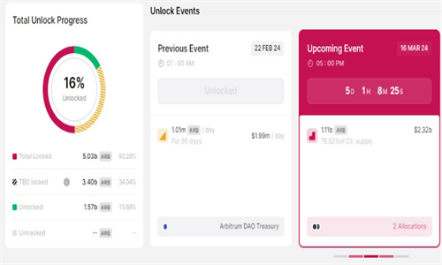 Layer 2区块链网络Arbitrum即将迎来一个重大事件:3月16日,价值23.2亿美元的Arbitrum (ARB)代币将被解锁。这无疑会引起加密货币市场的广泛关注,并可能对ARB代币的价格产生重大影响,甚至引发市场波动。