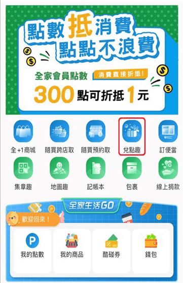 步骤一:打开全家超商App,点选主页的「兑点趣」或「我的点数」。