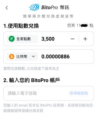 步骤四:确认比特币和想要兑换的全家点数后,你需要输入一个电子信箱,并按下「取得验证码」。如果已经注册过币托,直接输入注册币托使用的email即可。如果没有注册,系统会自动帮你建立一个BitoPro 帐号。