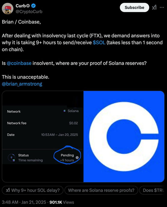 有人抱怨说,交易处理时间要 1 到 15 个小时,这让大家开始怀疑 Coinbase 的基础设施到底能不能扛得住这么大的交易量。一位用户吐槽说:“我们需要一个解释,为什么发送和接收 SOL 要 9 个多小时?链上明明只要不到 1 秒!这完全不能接受!”