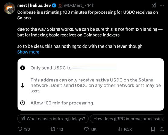 Solana 基础设施提供商 Helius 的 CEO Mert Mumtaz 自己做了个测试,发现 Coinbase 在 Solana 上处理 USDC 的接收,预计要 100 分钟。他说:“这不是 Solana 区块链的问题,而是 Coinbase 的基础设施没有充分针对不同链的特性进行优化。”