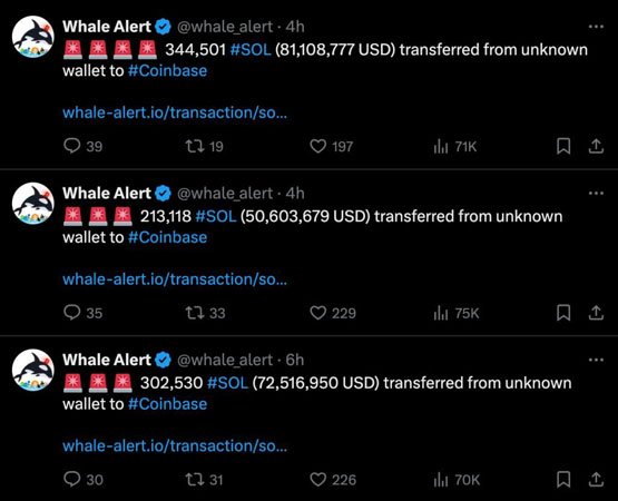 有趣的是,区块链追踪平台 Whale Alert 的确追踪到了多笔来自未知地址的大额 SOL 被转入 Coinbase。至于背后的原因,就不得而知了。