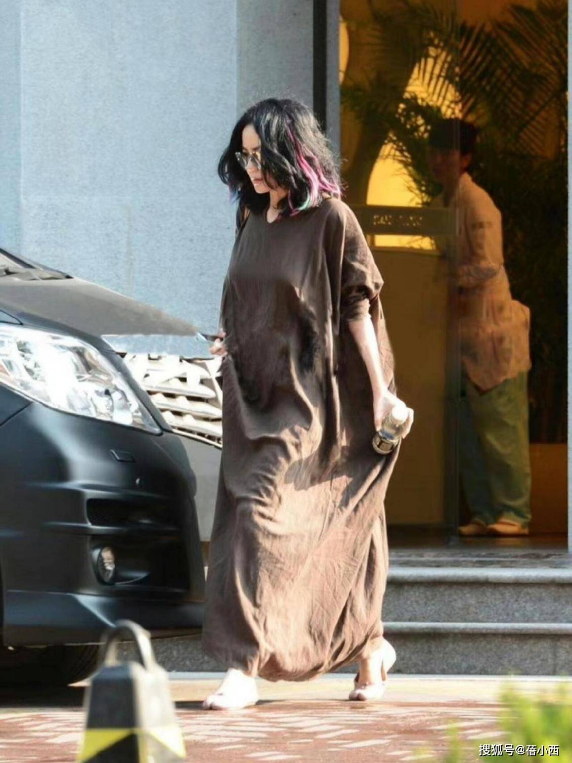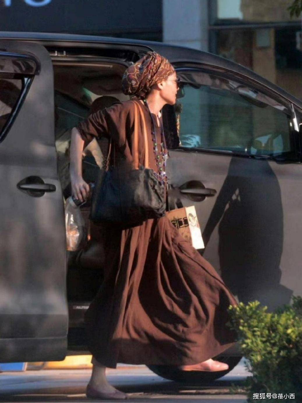再看她这一身连衣裙搭配,裙身选择哑光质感的亚麻面料,深棕色弱化了材质的粗糙感,反而透出低调的质感,再加上宽松的直筒版型+及踝长度,直接遮住了身材的所有缺点,并且在走动间形成自然的垂坠弧度,没有紧身款的束缚,却自带“慵懒不邋遢”的气场。