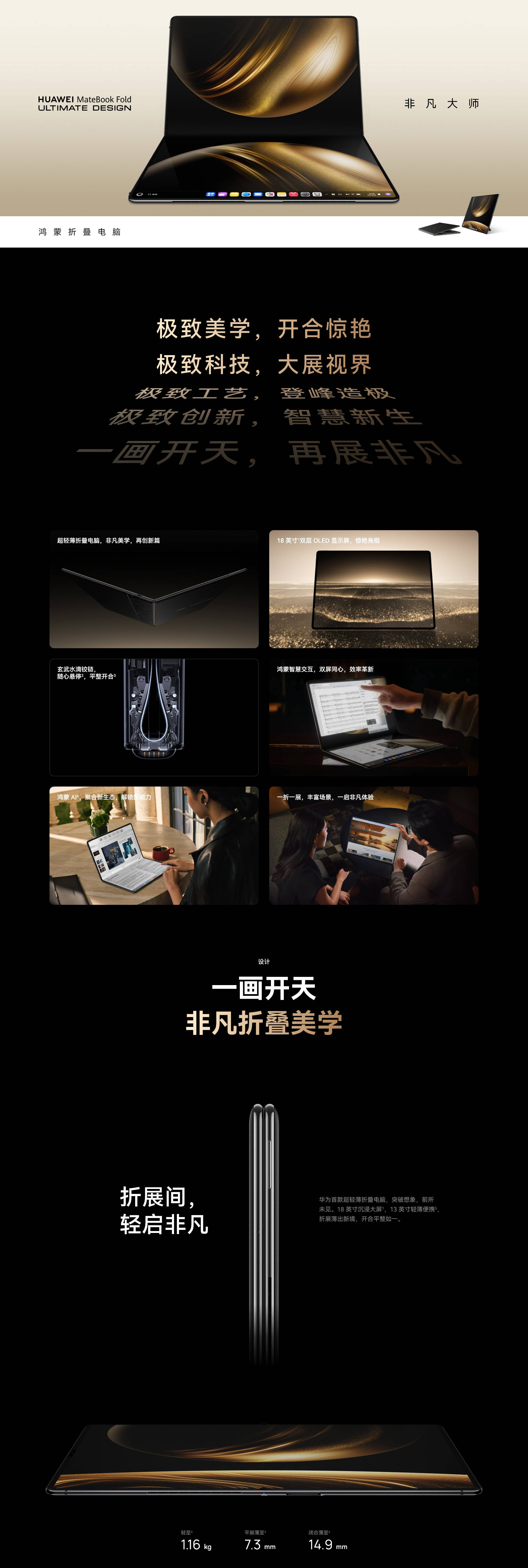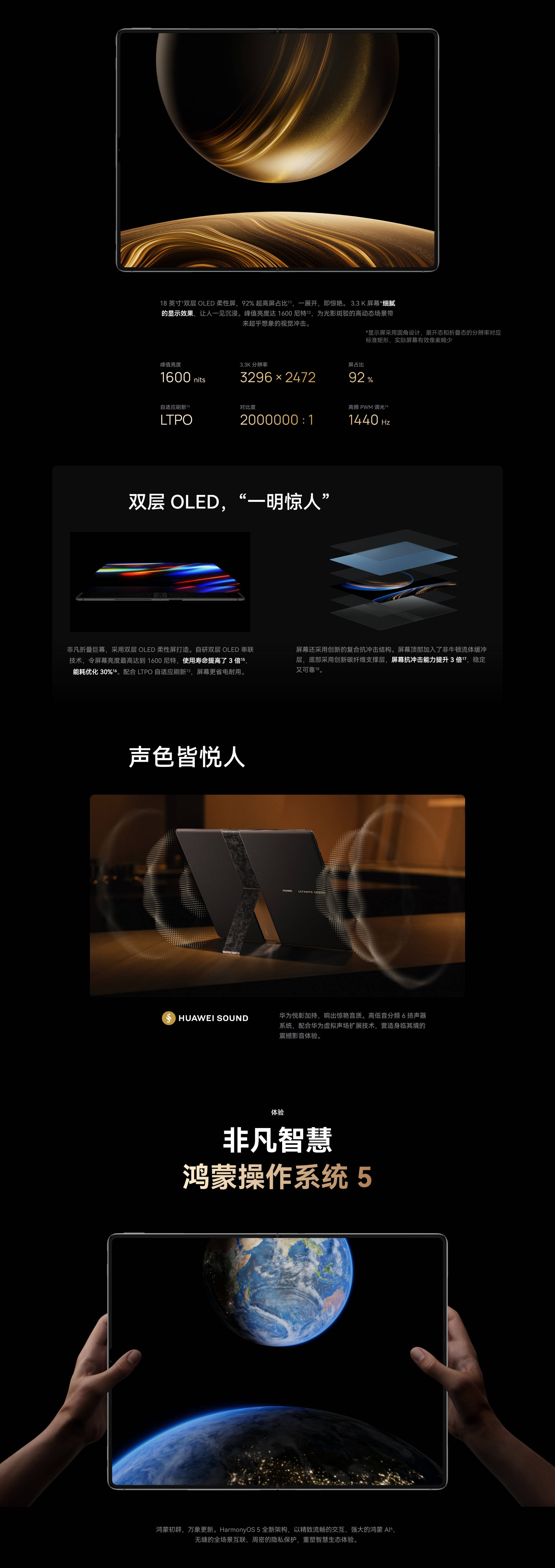 配置方面,华为 MateBook Fold 非凡大师搭载全球最大的双层 OLED 屏幕,具备 1600nits 高亮度、3.3K 高分辨率、2,000,000:1 超高对比度及 1440Hz 高频 PWM 调光频率,并支持自适应 P3 广色域、LTPO 自适应刷新率和 HDR Vivid。同时,它还配备了业界最大尺寸的折叠屏水滴铰链,支持 30°-150° 稳定悬停和大于 170° 的缓慢自展平特性。