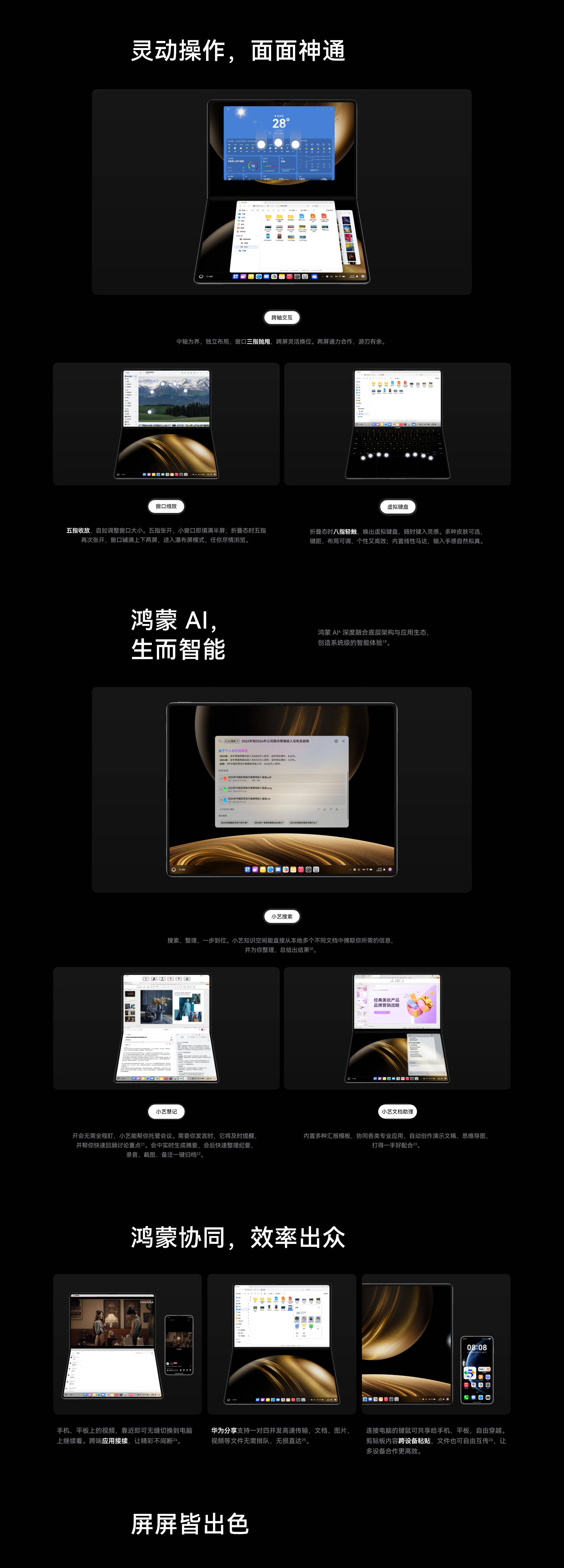 在系统层面,该设备搭载 HarmonyOS 5 系统,带来了更智能、更流畅、更交互、更安全、更精致的操作体验。该系统不仅重构了交互底层逻辑,能够智能识别触屏、键鼠、触控板等不同输入方式并自动匹配最符合直觉的响应模式,还深度融合了AI和智慧交互技术,可通过小艺慧记、小艺知识空间、小艺文档助理等功能,为用户提供更加便捷、高效的生产力工具。