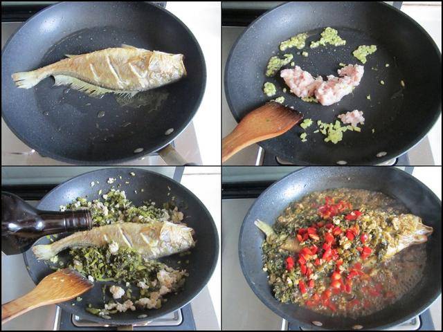 制作过程: 将黄鱼洗净后将表面水分吸干, 再划上几刀,以便入味。 烧热锅放入适量的油,将黄鱼放进锅中去煎, 一面煎至金黄后翻面将另一面也煎至金黄后盛出来。烧热锅放入适量的油,加入少许姜末煸炒香, 加入少许肉末翻炒至微微变色, 加入准备好的雪菜放进锅中翻炒几下, 将煎好的雪鱼放进锅中去煎,烹入少许料酒和生抽,再加入少许水焖煮八分钟,加入少许盐和红椒粒翻炒均匀,最后大火收汁后盛入盘中,撒上少许葱花即可。