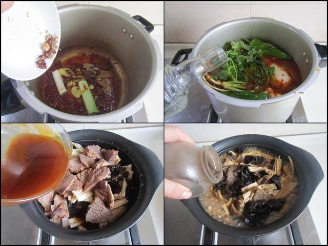 制作过程: 提前将腐竹和黑木耳用冷水泡软备用。烧热高压锅放入少许油,加入少许葱姜蒜片和郫县豆瓣酱、花椒粒等大料翻炒出红油,加入适量的水,再将准备好的牛肉块放进压力锅中, 加入少许高度白酒和生抽, 再加入准备好的香菜和整个洋葱帮助去腥, 用电压力锅将牛肉炖煮熟, 待其煮熟后加入少许盐拌均匀再浸泡1个晚上或者1个白天,以便入味,待其微微凉后切成片备用。 将泡好的腐竹和黑木耳, 再加入适量的牛肉和牛肉汤加热炖煮五分钟, 最后加入少许盐和胡椒粉调味,大火收汁后盛入钵中,撒上少许葱花即可。