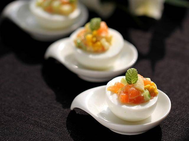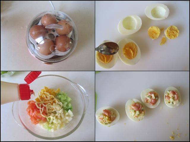 制作过程: 提前将鸡蛋放入煮蛋器中将其煮熟;将煮熟的鸡蛋去壳后对切成两半,再将鸡蛋黄用勺挖出来,将鸡蛋切成小粒备用;再将三文鱼、黄瓜和苹果都切成小丁备用。 将准备好的三文鱼丁、蛋黄丁、黄瓜丁和苹果丁放入大碗中,加入少许沙拉酱,将其拌均匀即可。 将准备好的三文鱼丁放入准备好的鸡蛋盏中,再摆放在盘中。