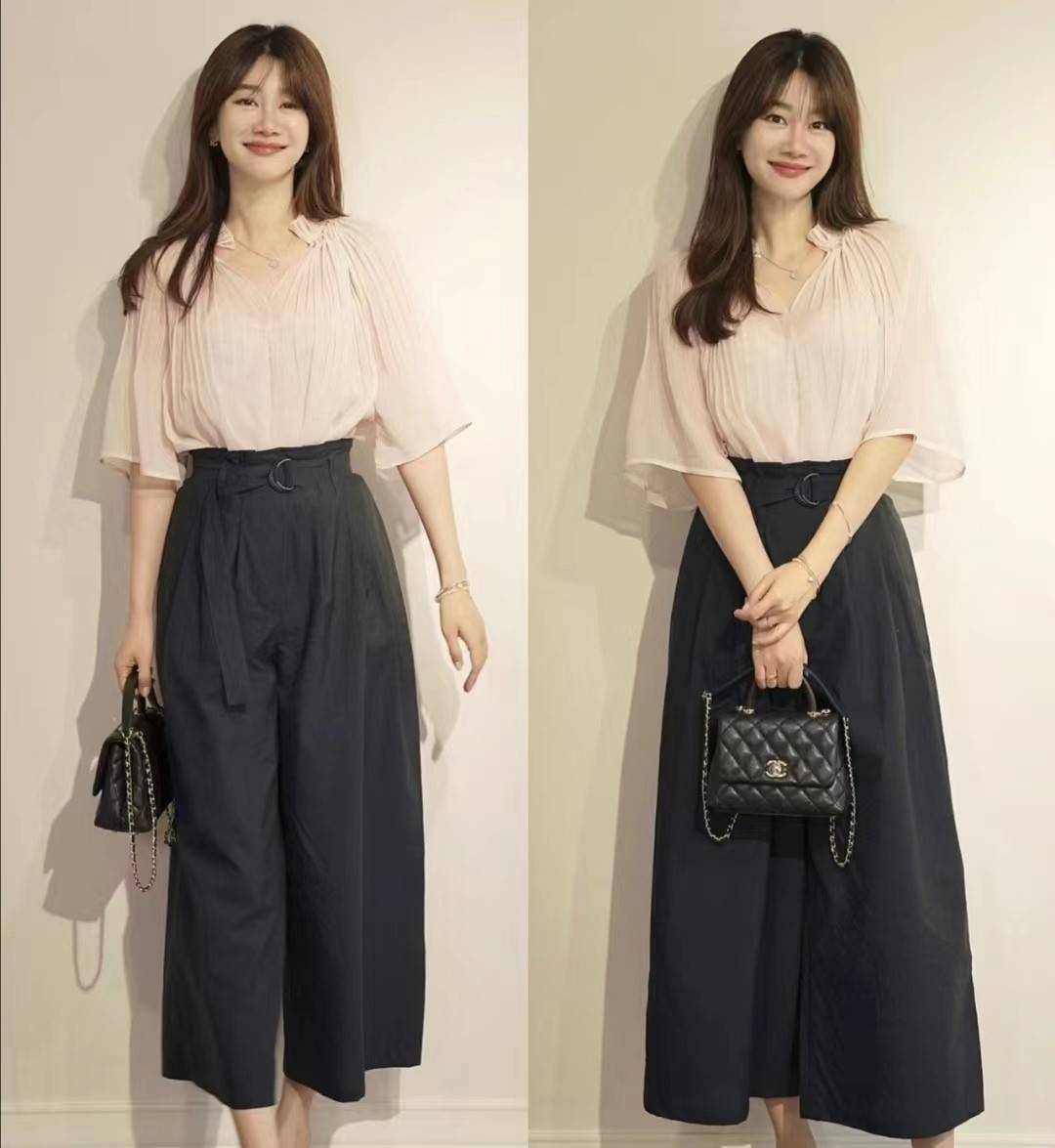 黑色阔腿裤特别容易驾驭,但是,会因为颜色略带沉闷感而显得不够清新。