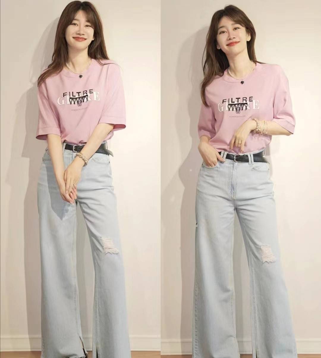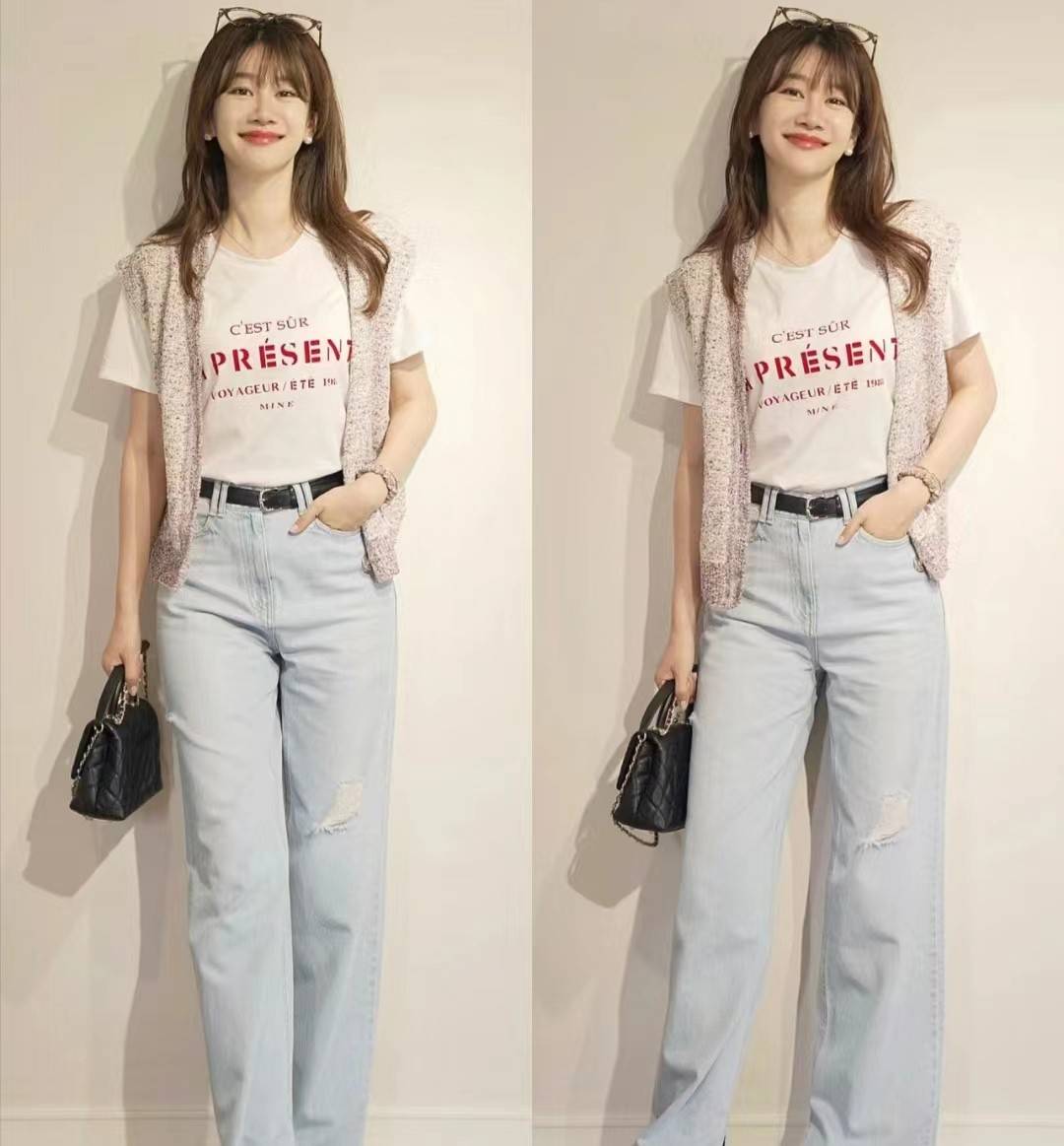 比如这款简单的白色字母T恤,它组合的就是淡淡的蓝色牛仔裤,将裤子向上提,并且用黑色皮带固定好,就会让腿部曲线变得更为修长好看。