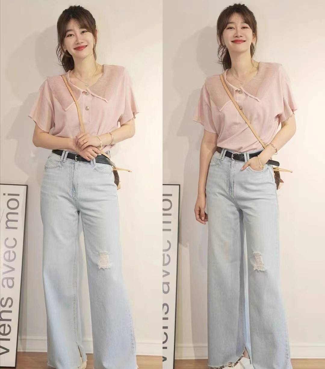 像这条蓝色牛仔裤,它是破洞裤的设计,但整个洞口的构造并不会太过于夸张,可以在上半身驾驭彩色的T恤,呈现出十分洋气活泼的风格。