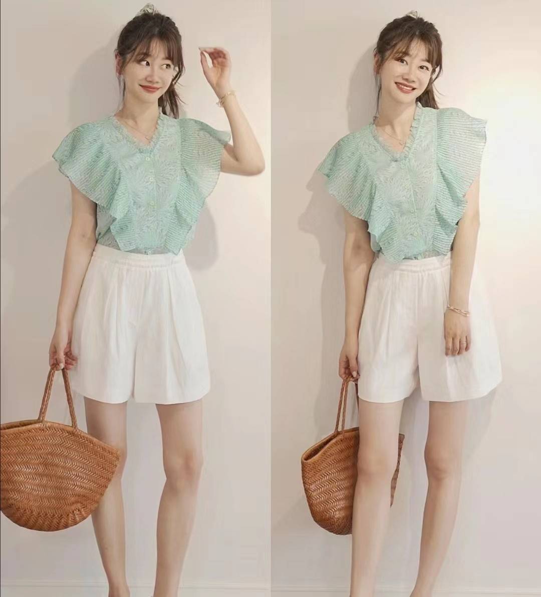 这款白色裤装,结合的就是绿色的衬衫,整个袖口的构造十分的飘逸,用荷叶边的裁剪,营造轻盈感,配色十分高级清冽。