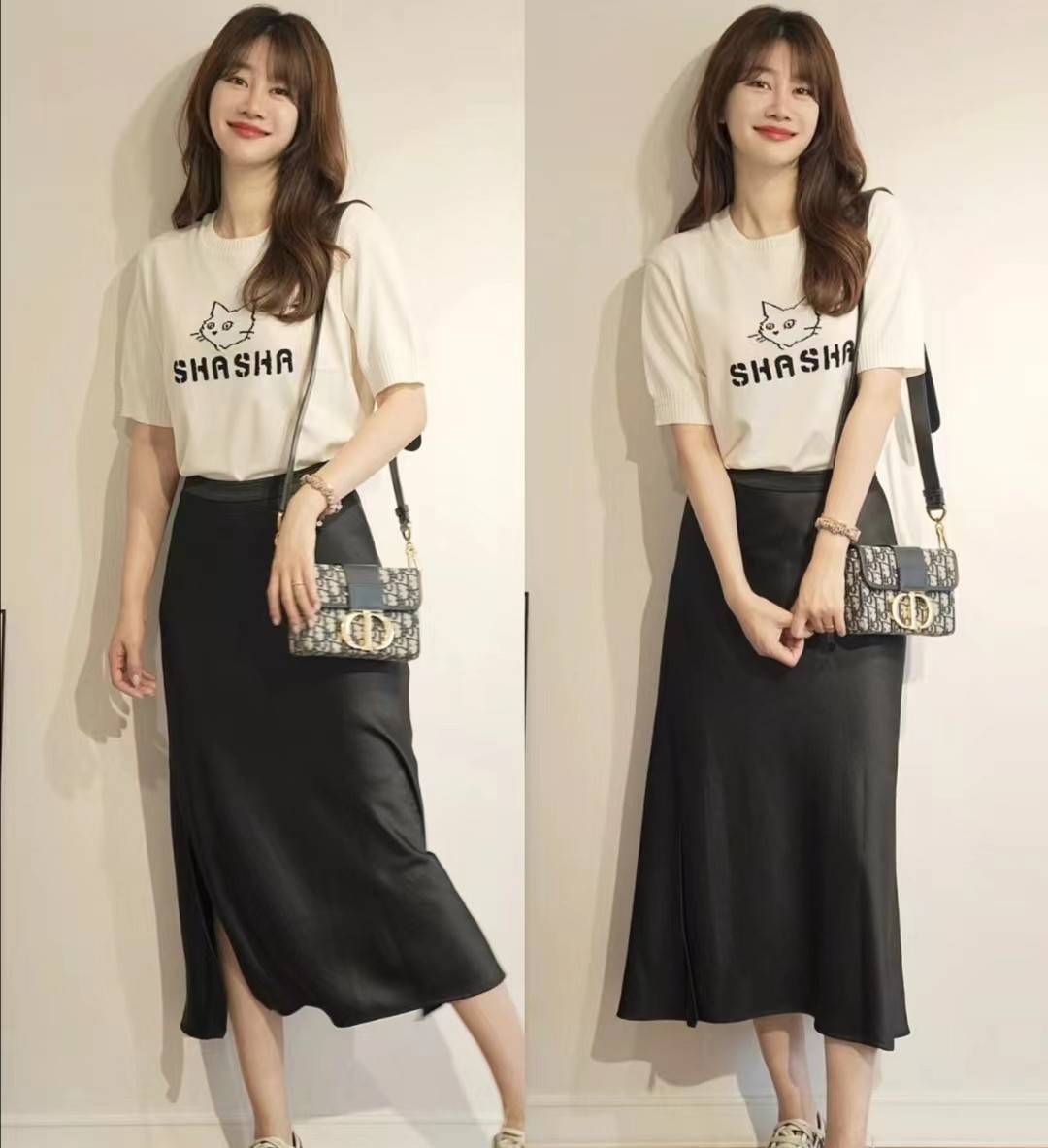 像这条黑色裙装,它就不存在对腿型的要求,简单的配一款字母T恤,就很得体。