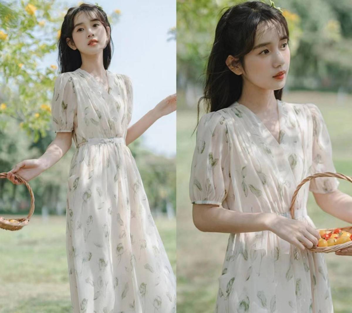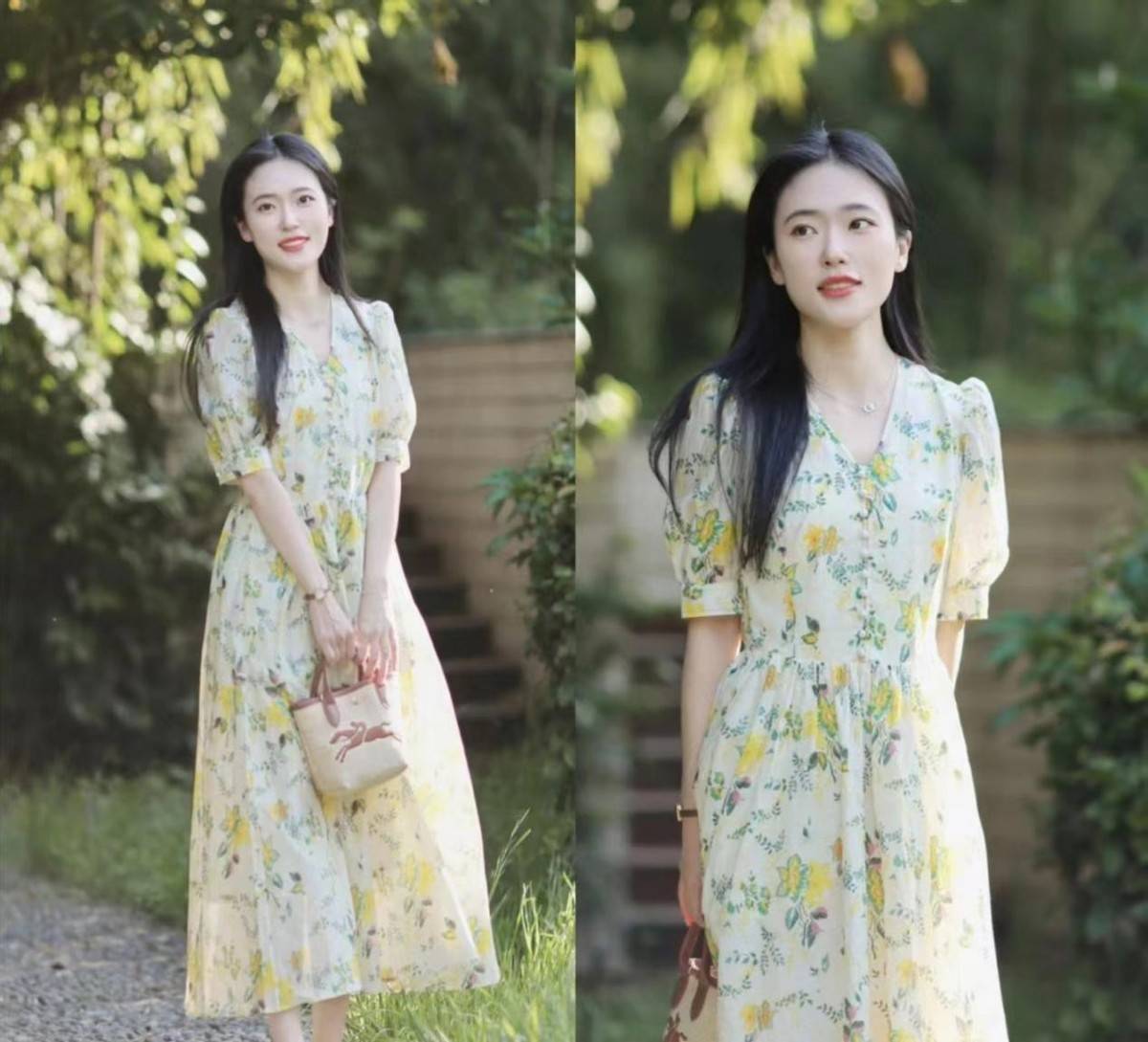 可以首选带有v领设计和泡泡袖元素的印花连衣裙,融入了这二者之后,就会形成对颈部线条的拉伸效果和对手臂掰掰肉的遮掩作用。