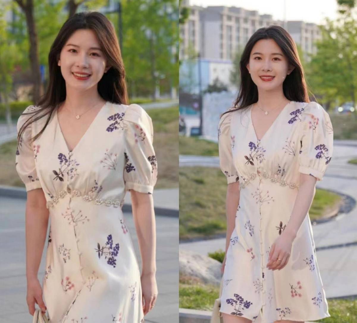 像这条连衣裙,它也是泡泡袖的设计,而腰部会稍微的收拢一些,呈现出顺滑的曲线,烘托出了臀部的饱满感,也能同时兼具对女人味儿的折射。