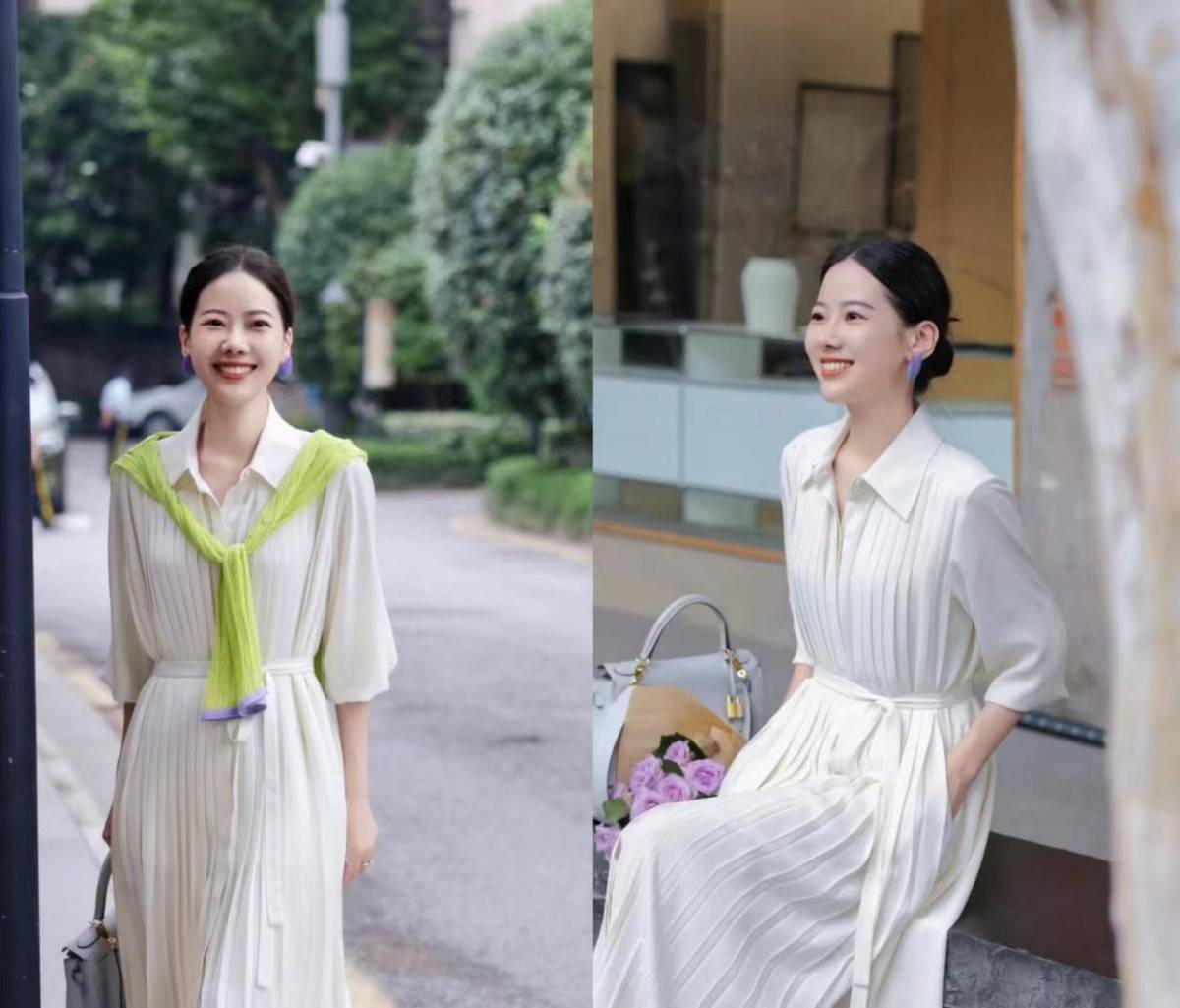 而白色运动鞋没有对身高的延长效果,可能需要大家选取带有腰带的衬衫裙装,才能显得比例好看。