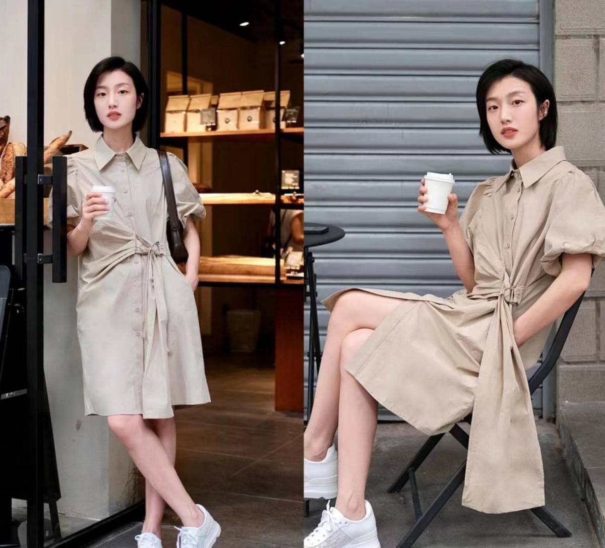 衬衫裙可以营造显瘦又显气场的作用,而在鞋子的配合上,不一定总是要以高跟鞋为主,还可以换成舒适的白色运动鞋。